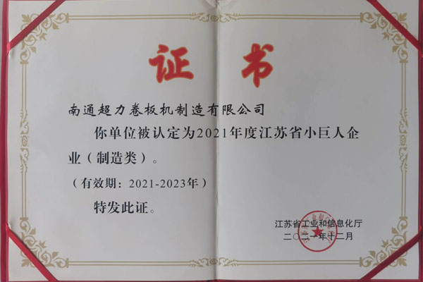 超力卷板機獲2021-2023年度江蘇省小巨人企業(yè)證書(shū)